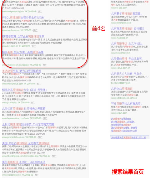 有調(diào)查數(shù)據(jù)顯示,當(dāng)用戶搜索之后,不用上下移動瀏覽窗口時就能看到的搜索結(jié)果被點擊的可能性最大。所以,根據(jù)不同的顯示器分辨率,前4名是最佳的搶占位置。