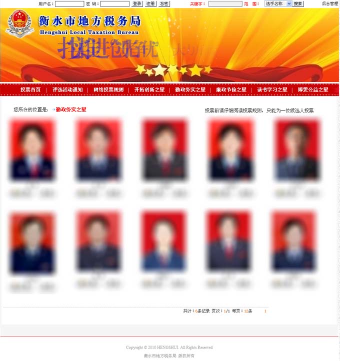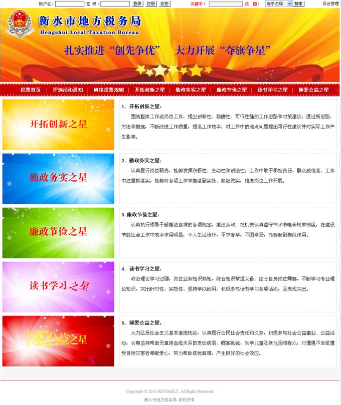 衡水起航網(wǎng)絡(luò)科技有限公司承接了此次人物評選投票活動的網(wǎng)絡(luò)投票程序任務(wù)。經(jīng)過三個日夜的緊張測試,網(wǎng)絡(luò)投票系統(tǒng)已在地稅局內(nèi)網(wǎng)正式上線,投票將于18日上午9:00開始,此次“季度之星”評選共設(shè)置“開拓創(chuàng)新之星”、“勤政務(wù)實之星”、“廉政節(jié)儉之星”、“讀書學(xué)習(xí)之星”、“博愛公益之星”五個類別,每個類別最終產(chǎn)生“季度之星”1名。